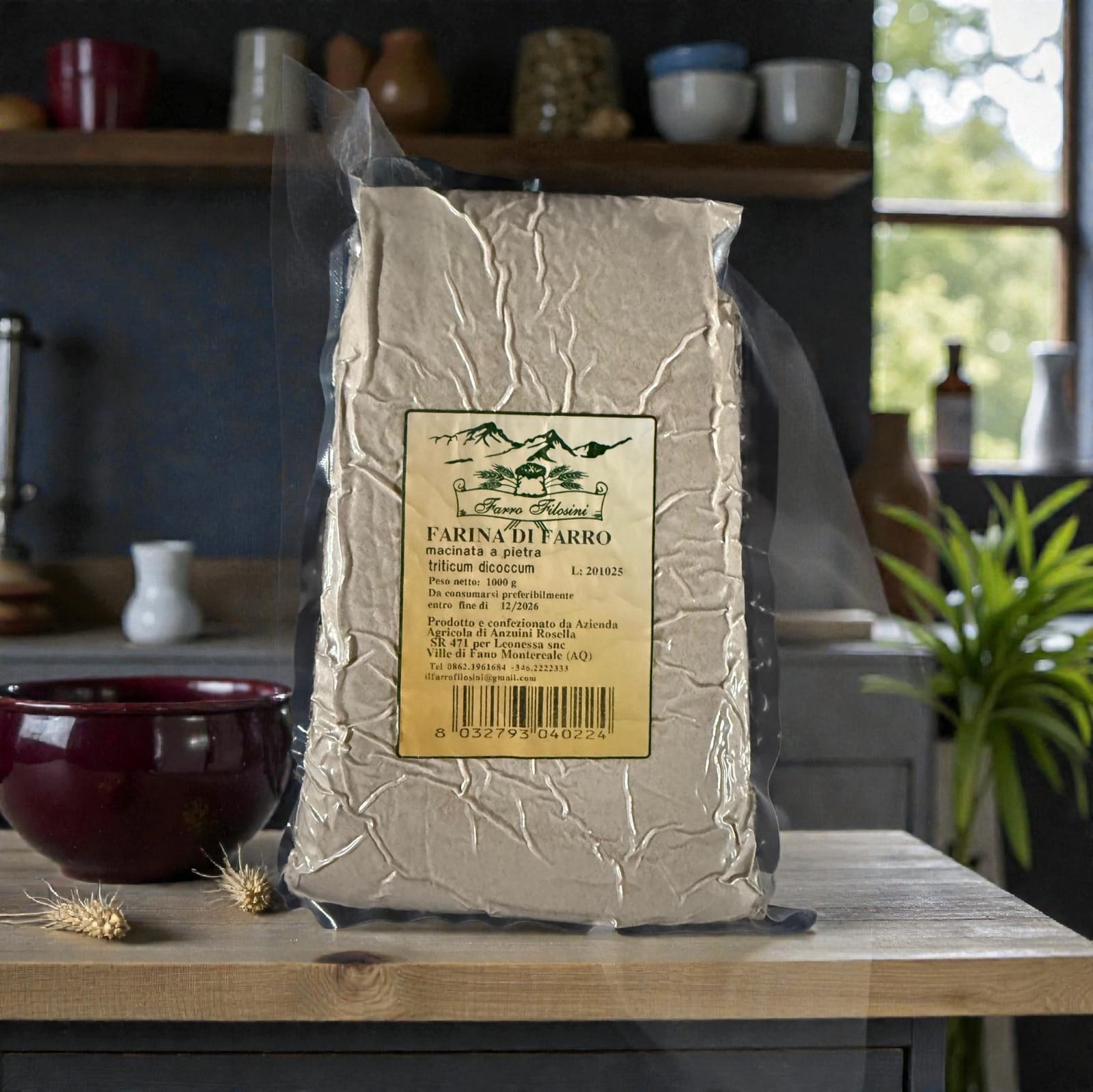Farina di Farro to tradycyjna włoska mąka orkiszowa, wytwarzana z pszenicy orkisz (Triticum dicoccum) i mielona na kamieniu, dzięki czemu zachowuje pełnię smaku, aromatu oraz naturalnych wartości odżywczych. Produkt pochodzi z lokalnej włoskiej uprawy i jest wytwarzany w niewielkich partiach zgodnie z rzemieślniczą tradycją.